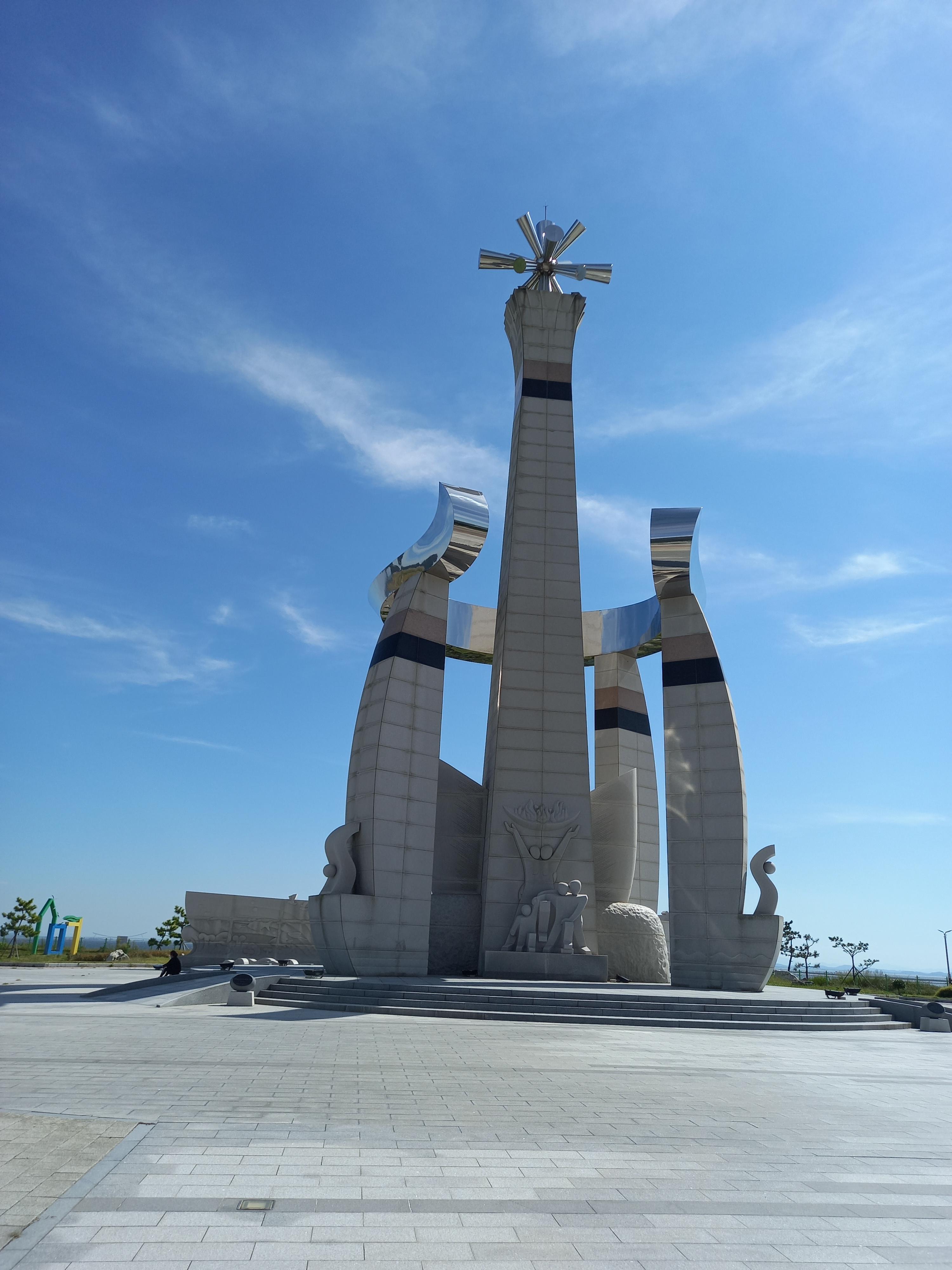 세계에서 가장 긴 새만금방조제 준공 기념탑이 군산에서 부안으로 가는 신시도 주차장 앞에 우뚝 서 있습니다.