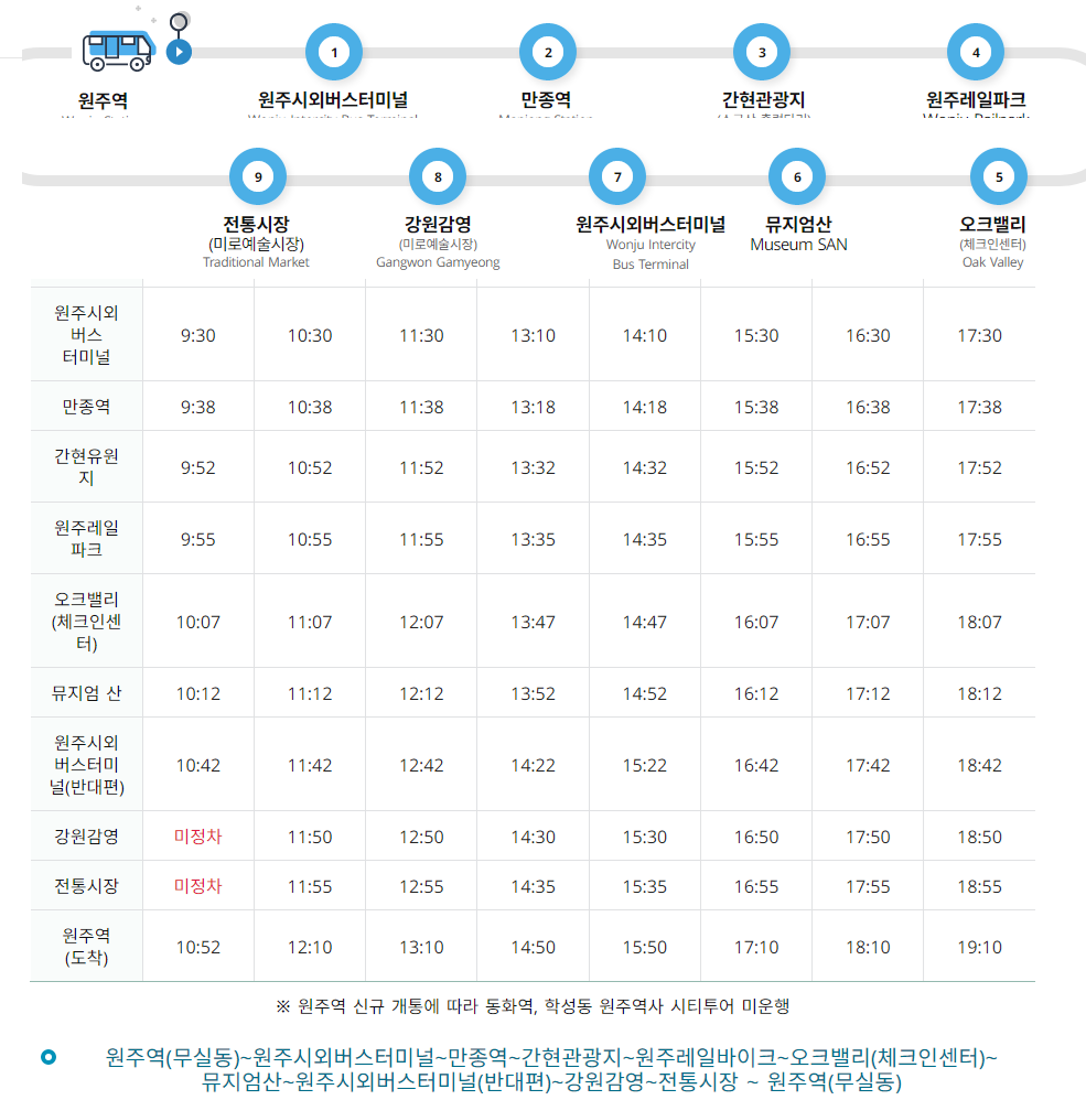 운행시간표 - 승차장소, 1회, 2회, 3회, 4회, 5회, 6회, 7회, 8회 순으로 내용 제공 승차장소 1회 2회 3회 4회 5회 6회 7회 8회 원주역 (출발) 9:20 10:20 11:20 13:00 14:00 15:20 16:20 17:20 원주시외버스 터미널 9:30