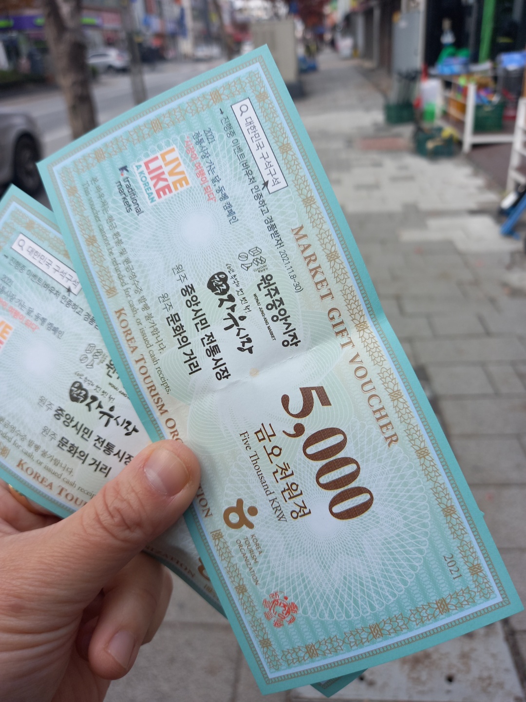 1일 버스비가 5000원인데, 원주중앙시장에서 사용할 수 있는 상품권 5000원으로 돌려주셨으니 투어버스를 무료로 이용하는거네요? 득템했어요 완젼 ㅎㅎ